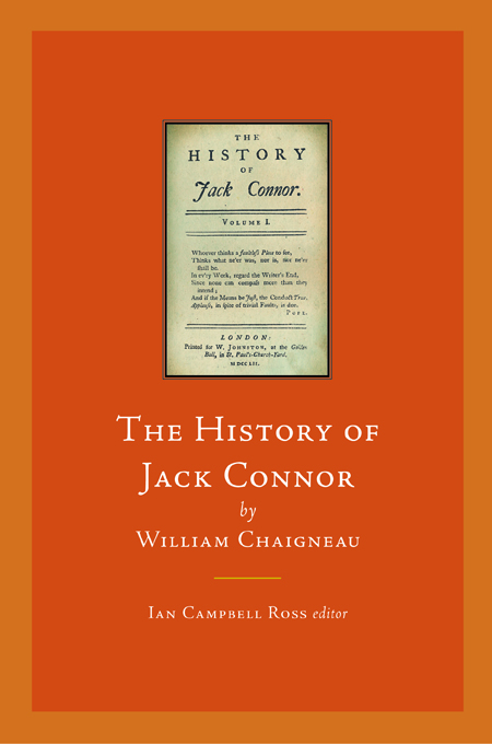 The history of Jack Connor (1752) is the only, and once very popular, novel of the Irish writer of Huguenot descent, William Chaigneau (1709–81). An example of sentimental picaresque fiction in the manner of Alain-René Lesage’s Gil Blas (1715–47) and Tobias Smollett’s Roderick Random (1748), the work also reveals Chaigneau’s admiration for Henry Fielding’s then-controversial Tom Jones (1749). The entertaining wanderings of Jack Connor take him from his birth and childhood in an Ireland described in unusual detail, through London, Paris, Flanders and Spain, before returning him to the Co. Limerick of his birth. Describing the novel as a ‘truly moral tale’, the London Monthly Review (1747) acknowledged the justice of the author’s ‘smart reprisals upon the English, for their national and vulgar prejudice against their brethren of Ireland’.